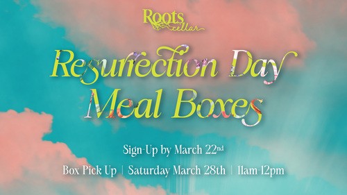 These boxes include everything needed for a Resurrection Day dinner. You can sign up to receive a meal box yourself or request one for someone you know who could be blessed by it. If you’re signing up someone outside of Roots, we do ask that you plan to meet them here at pickup so you can make that personal connection.