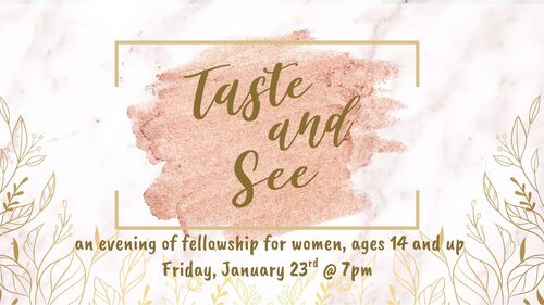Ladies, you're invited to our next Taste & See on Friday, Jan. 23 at 7pm in the Commons. Taste & See is a lovely evening of worship, listening to a sister share her testimony and connecting with other women in meaningful fellowship. Come be encouraged and refreshed!