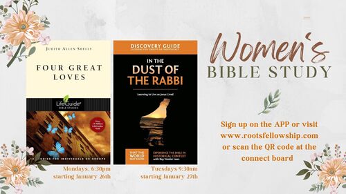 Monday night begins January 26, and that group will be studying Four Great Loves: God, God's Word, God's people and God's purposes in the world.